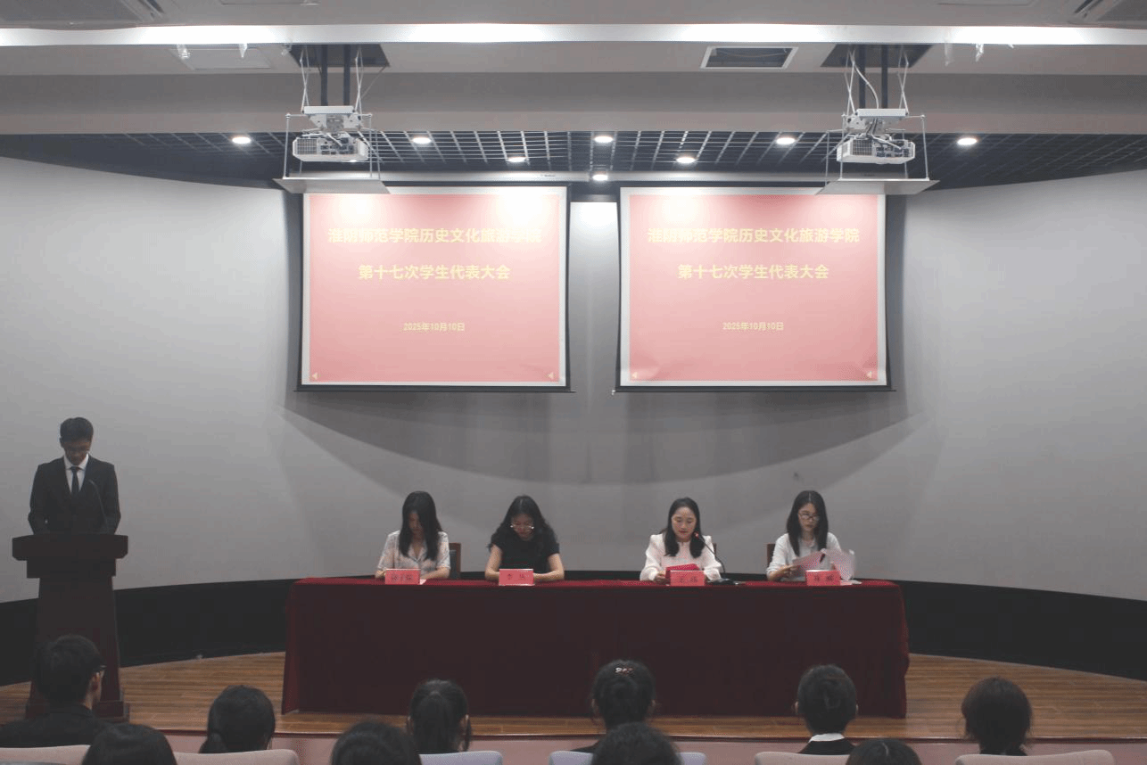 10月10日下午,淮阴师范学院历史文化旅游学院第十七次学生代表大会在弘文3-201召开。历史学院党委副书记王玮,团委书记林麟,辅导员李丛、陈子璇出席本次会议,123名学生代表参加了本次会议。